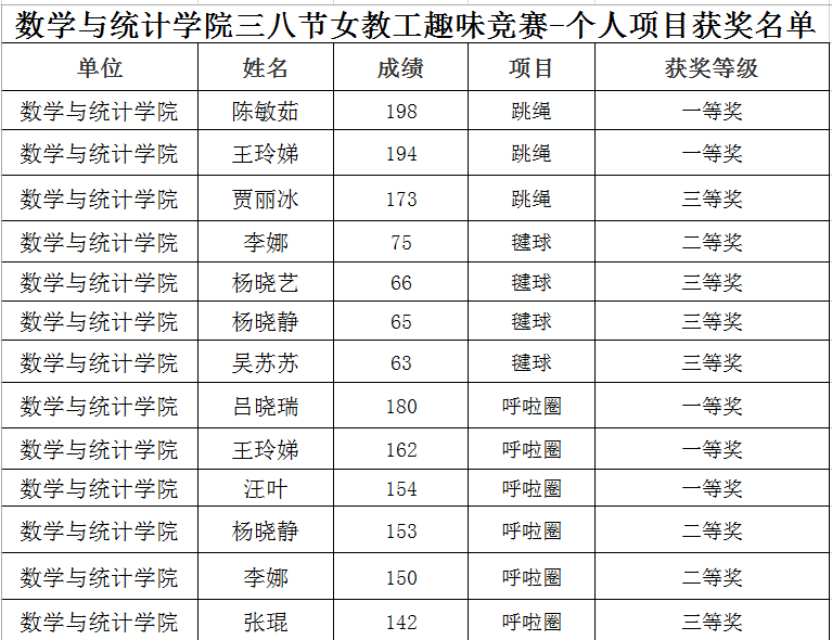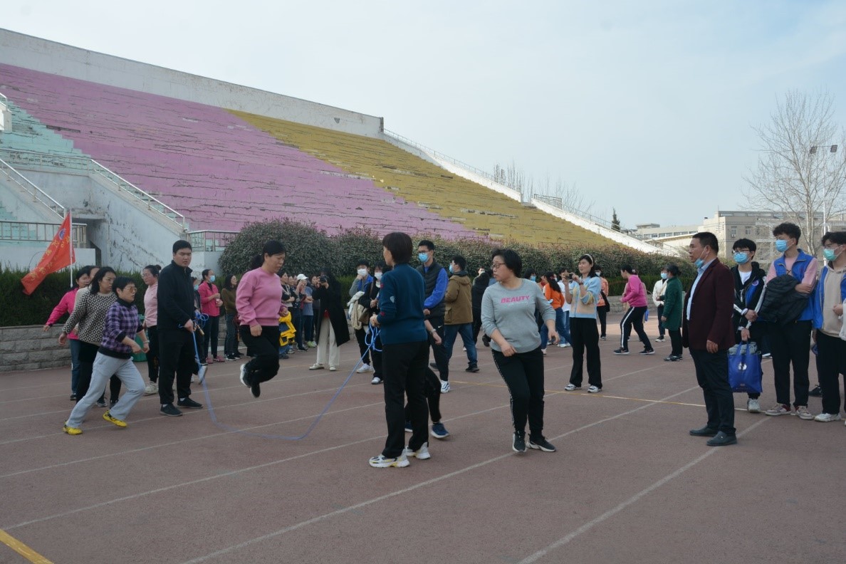 本次竞赛分集体项目和个人项目两大类。集体项目开始前,史富强带领女教职工们积极热身准备;比赛中,参赛女教工紧跟绳子的节奏跳跃、奔跑,跳绳与摇绳默契配合,展示了学院教职工团结一致、勇于拼搏的精神风貌,并荣获三等奖。在键球、跳绳、呼啦圈等个人项目中,我院女教工踊跃参赛,展现了“巾帼不让须眉”的风采和自尊、自信、自立、自强的精神风貌。
