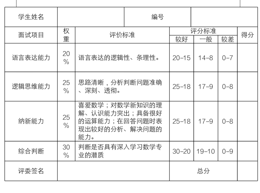 数学与应用数学专业拔尖人才实验班遴选面试评分表
