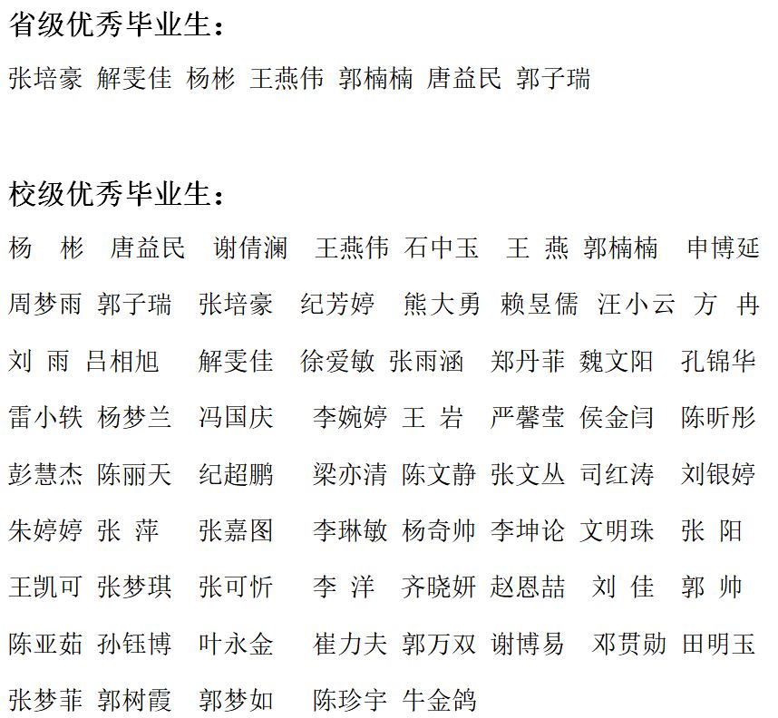 按照河南省教育厅关于评选<<河南省普通大中专学校2020年优秀应届毕业生通知>>要求及<<蜜桃视频 全日制普通本科生奖励办法>>的有关规定,2020届毕业生通过民主评议,特评出省级校级优秀毕业生和优秀实习生若干,予以公示如下: