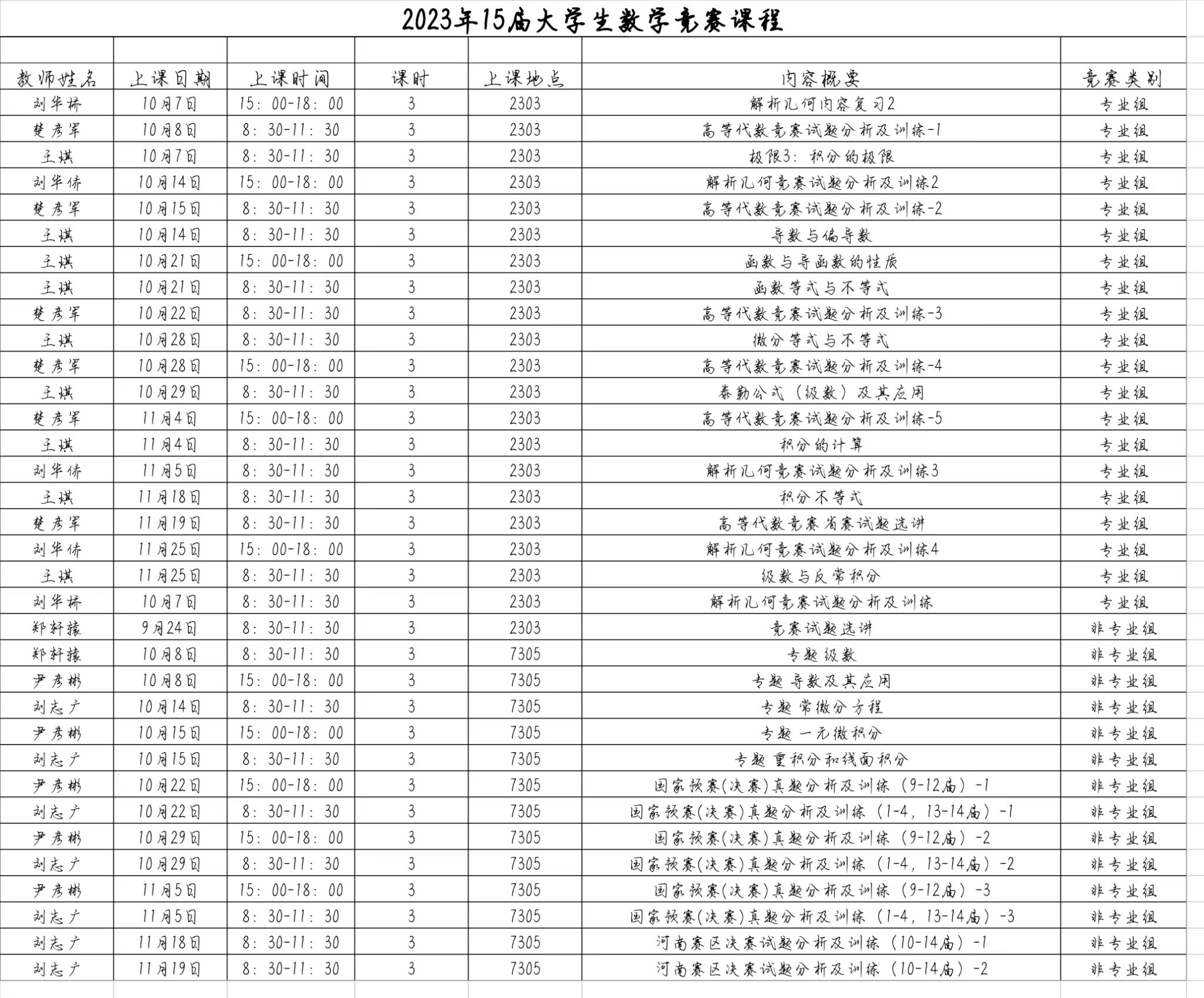 同学们好, 2023年全国第15届大学生数学竞赛预赛初定于11月11日(周六)9:00-11:30举行。为帮助同学们做好赛前准备工作,蜜桃视频 将组织有经验的老师进行赛前免费培训, 培训分为专业组和非专业组, 具体培训内容和时间详见下表