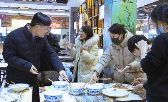 在在学校北苑餐厅二楼举办举行“饺子飘香,校园情浓”主题冬至包饺子活动。学院党委书记曹志伟,党委副书记刘佳明,副院长杨一平及本科生、研究生辅导员和各年级学生代表340余人一起包饺子、过冬至。