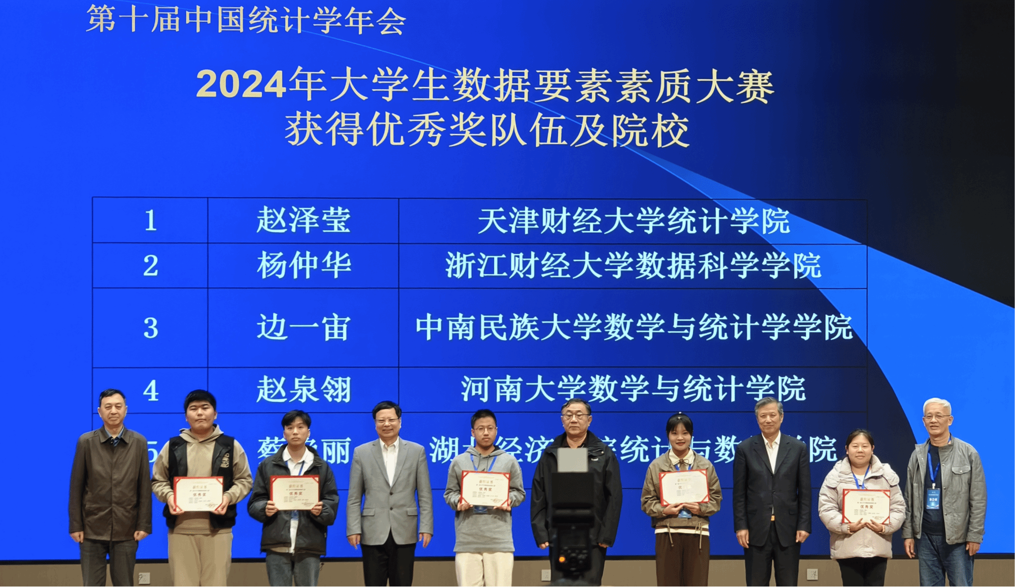 学生团队凭借出色表现从全国75所高校1374名参赛学生的364件参赛作品中脱颖而出获得优秀奖,受邀参加10月19至20日第十届中国统计学年会上举行的大赛颁奖典礼,并作为两支获奖代表队之一在年会上做了大赛经验分享。