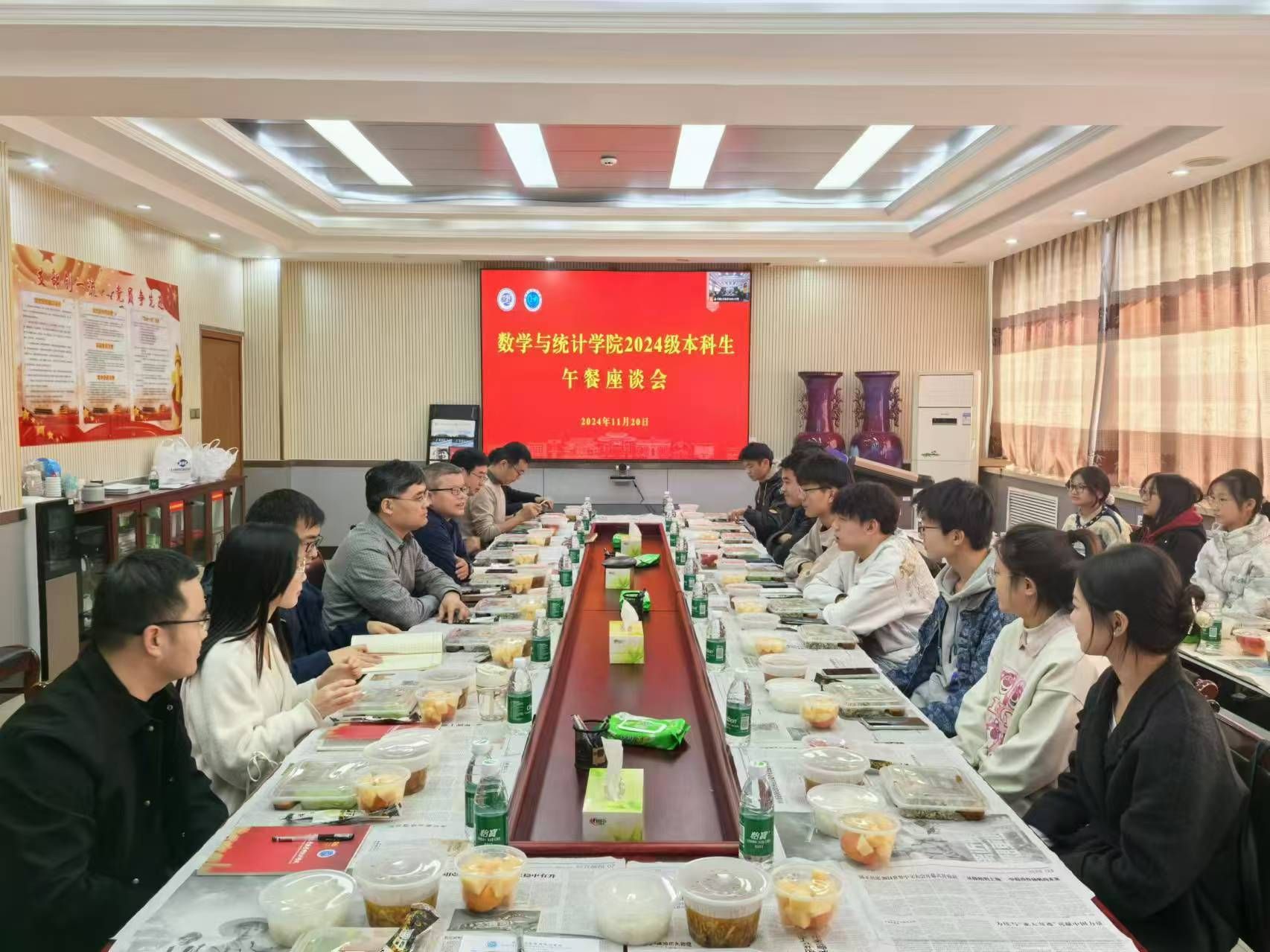 在二楼会议室举行了2024级本科生午餐座谈会。学院党委书记曹志伟,院长韩小森,副院长杨一平、解俊山、王中华,2024级本科生辅导员、班主任以及近20名学生代表参加此次座谈会,特邀首都师范大学教授、数学与统计学原院长吴可线上参会,座谈会由韩小森主持。