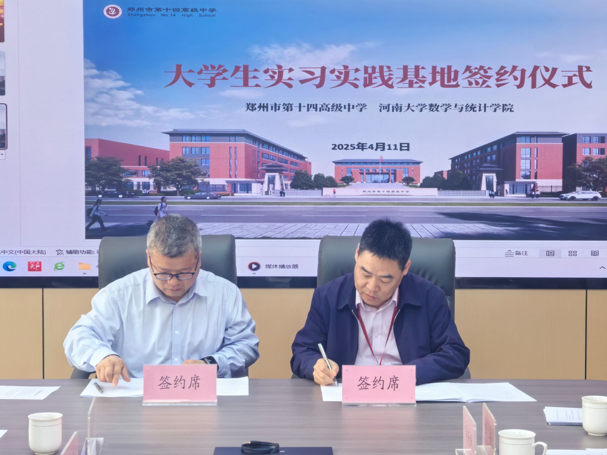 郑州市第十四高级中学校长张帆与韩小森签署合作协议,并共同为教育实践基地揭牌。