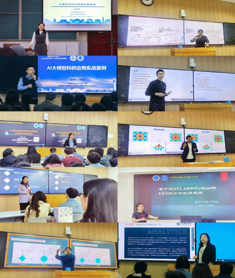 本次课程精心设计十大模块,内容涵盖人工智能前沿理论与多元应用场景。杨晓慧教授聚焦智慧办公与教学场景,深入剖析 DeepSeek 等大模型、知识图谱的实际应用;郑晨教授结合科研需求,展示 ChatGPT、Kimi 等大模型在编程辅助、文献处理、PPT 制作中的高效应用。在算法理论与实践层面,杨利军副教授带来 RNN、Transformer 及其变体模型的原理精讲与实战案例;何妍博士围绕图形因果建模、潜在结果模型展开深度教学,并辅以生动案例演示。此外,辛欣副教授深挖超高维与高维数据的统计方法,陈花萍博士讲解了 GARCH 模型在整数值时间序列分析的创新应用。在编程实践领域,李哲源教授以 “基于 R 的数值模拟和并行计算应用实战”为题,以 Bootstrap 可信区间计算等为例展示并行计算的效能;邹广安副教授讲授了北太天元编程在科学计算中的独特优势;杨晓艺副教授则带领学员探索 MATLAB APP Designer、Python tkinter 的图形用户界面设计奥秘;苏丽敏博士通过 PowerBI+DeepSeek 组合,呈现智能数据处理与视觉分析的精彩案例。
