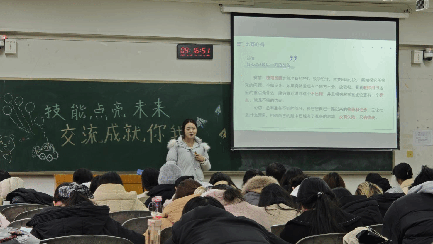 最后,程永胜老师高度肯定了教学技能竞赛对提升学生专业素养与实践能力的重要意义,强调荣誉的背后是日复一日的辛勤付出,勉励同学们树立终身学习理念,持续拓宽学术视野。张玉环老师对四位同学毫无保留的分享以及刘依同学的精彩主持表示诚挚感谢,并希望全体参会同学以此次分享会为契机,吸收借鉴宝贵经验,在后续学习中查漏补缺、提升自我,为未来参与教学技能竞赛、规划职业发展方向筑牢根基。