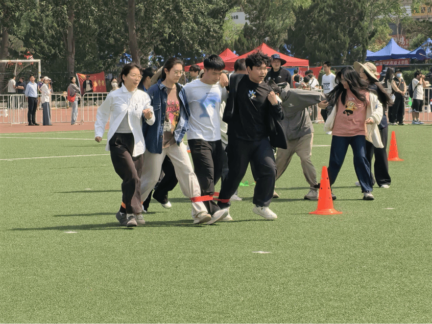 如果说个人项目是英雄的角逐,那集体项目便是团结的赞歌。学院学子在集体项目中万众一心、默契配合,将团队力量发挥到极致。集体跳绳中,长绳翻飞如彩虹,队员们身姿轻盈、节奏统一,鱼贯而入、跳跃自如,每一次整齐的起落,都凝聚着日常训练的汗水与无间的默契。
