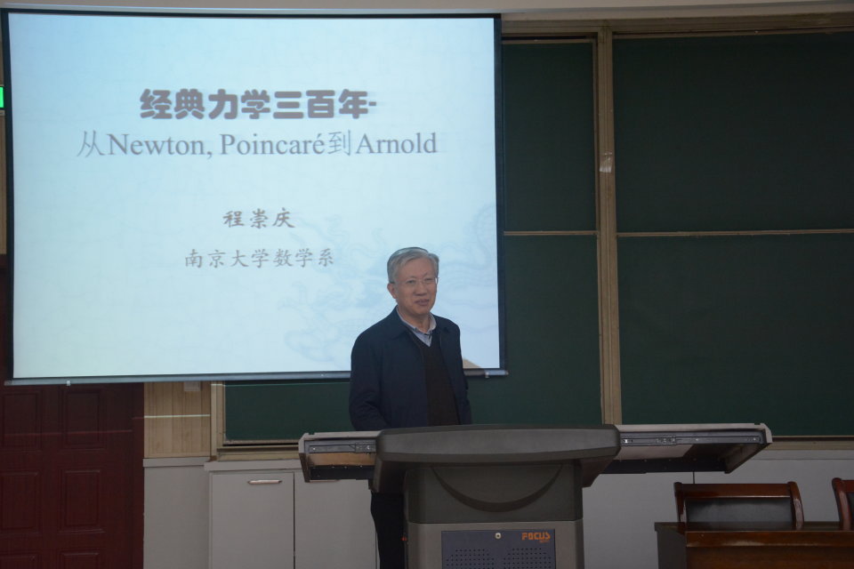 程崇庆他以经典力学为起点,强调了力学学习对于数学研究的益处。他从物理学的泰斗人物开普勒、牛顿、胡克等入手,介绍了其相关理论和成就,并由此转向了数学方面,就拉格朗日定理、费马定理等作了讲解。程崇庆用深入浅出的语言,对三体问题、Poincare最终几何猜测及回归定理、KAM理论的重大意义、Arnold扩散及最新进展等进行了介绍。与会师生与程崇庆教授就Arnold扩散等有关问题进行了深入讨论。