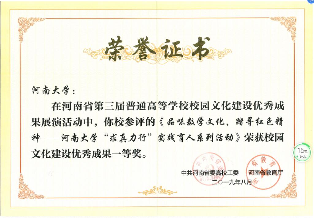 “求真 力行”实践育人系列活动荣获河南省第三届普通高等学校校园文化建设优秀成果一等奖。
