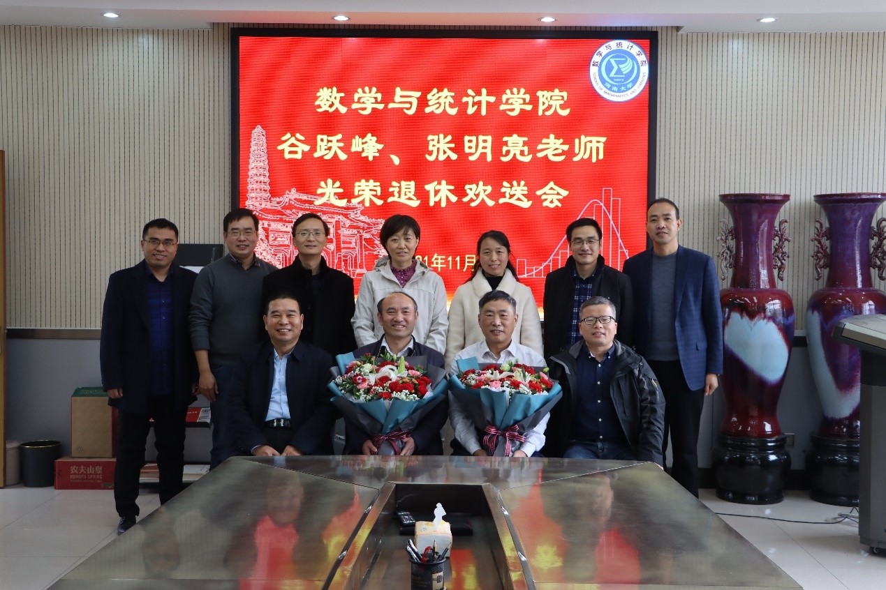 在二楼会议室举行退休教师欢送会,欢送谷跃峰老师、张明亮老师光荣退休。院领导班子全体成员、数学教育系系主任、党支部书记和院办负责人参加欢送会。会议由院党委书记史富强主持。