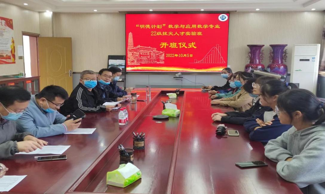 2022级“明德计划”数学与应用数学拔尖人才实验班开班仪式于学院二楼会议室举行。院长韩小森、院党委副书记赵红磊、副院长解俊山、实验班班主任刘根强,实验班导师代表龚克、陈敏茹、乔少霞,2022级辅导员吴苏苏和25位实验班同学参加仪式。会议由解俊山主持。