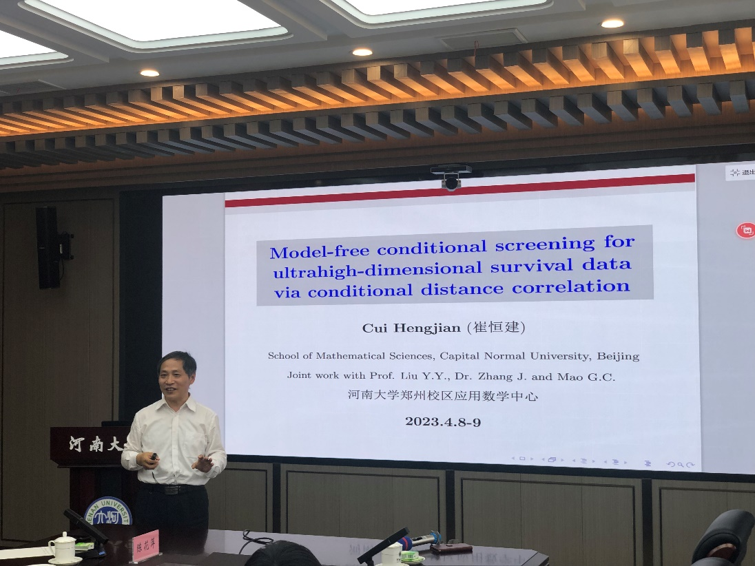 座谈会后,崔恒建老师还应邀为参会师生举行了一场名为“Model-free conditional screening for ultrahigh-dimensional survival data via conditional distance correlation”的统计学术报告。