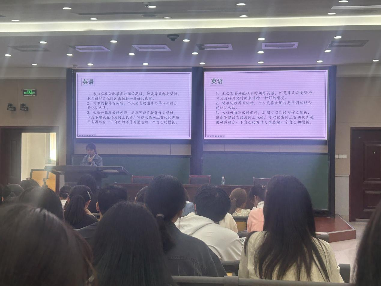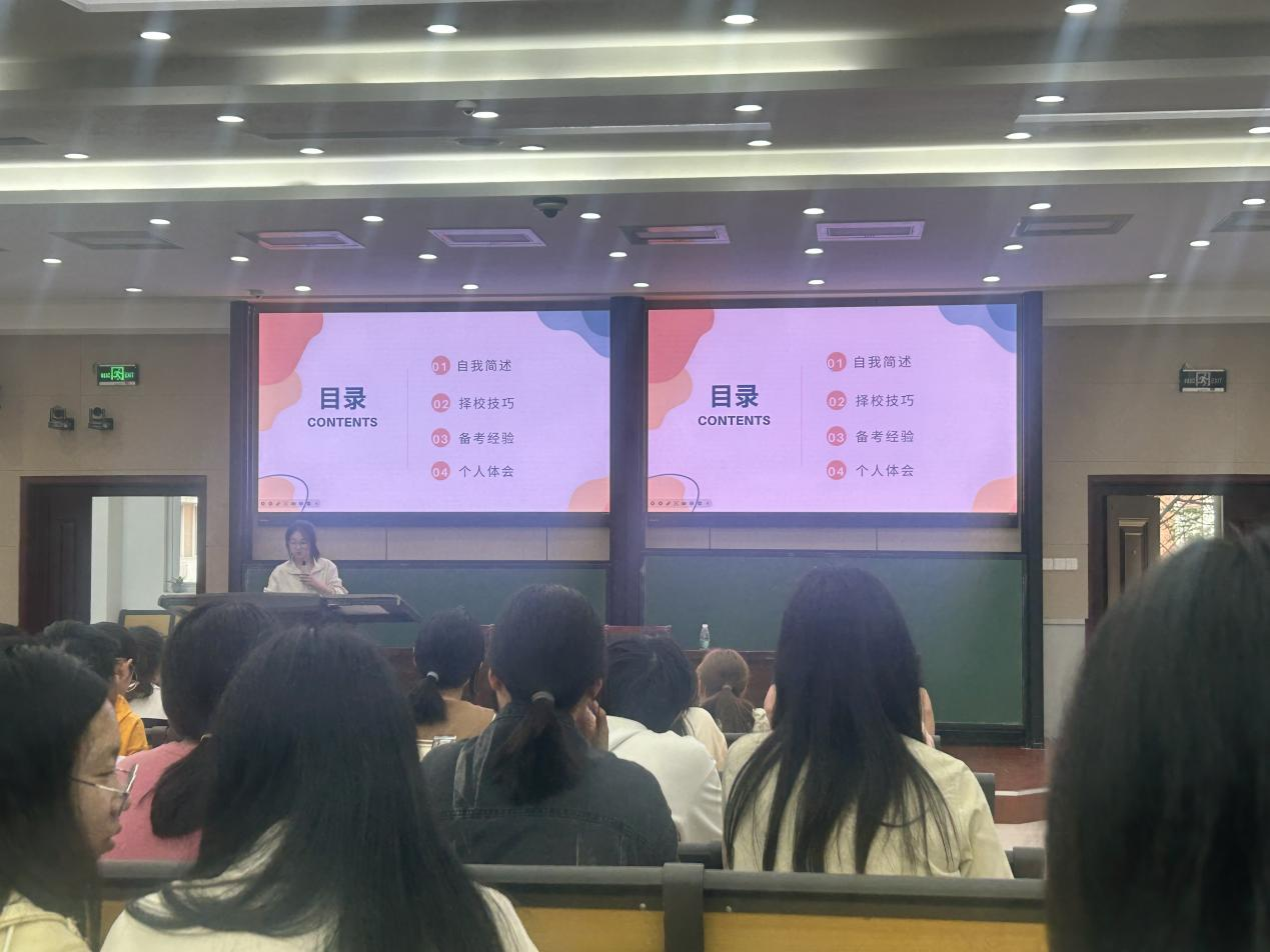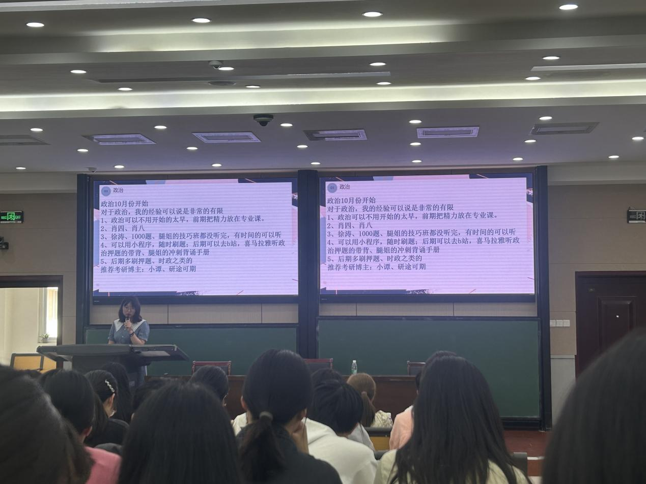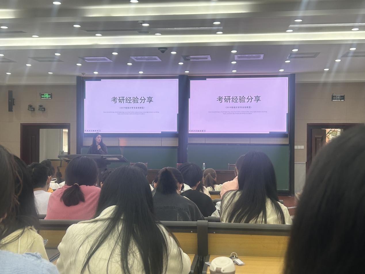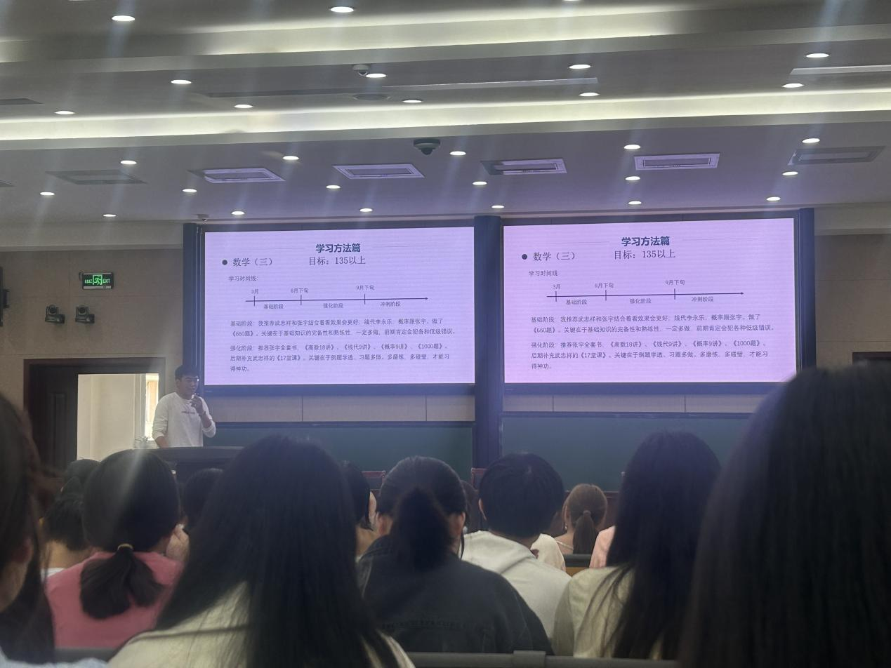 ,他谈到,要做自己的生涯规划,确定自己的目标,很多科目可以多背模板,多练习模拟题,以此提高自己的复习效率。金融数学专业席腾浩,考研至大连理工大学,强调了择校的重要性,介绍了自己的学习模式以及学习方法。金融数学专业李勇奇,考研至中央财经大学,介绍了择校技巧,选择城市,解答了选择学硕还是专硕的问题,给学弟学妹们介绍了历年录取情况的重要性,以及对应的学校档次。统计学专业的张雅斐,考研至西南大学,详细地给学弟学妹们介绍了所用的书籍,网课,以及自身计划。统计学专业张晓昱,考研至吉林大学,她介绍了考研时需要先定专业,了解所需考的科目,再选择学校,要做好自己的计划安排。