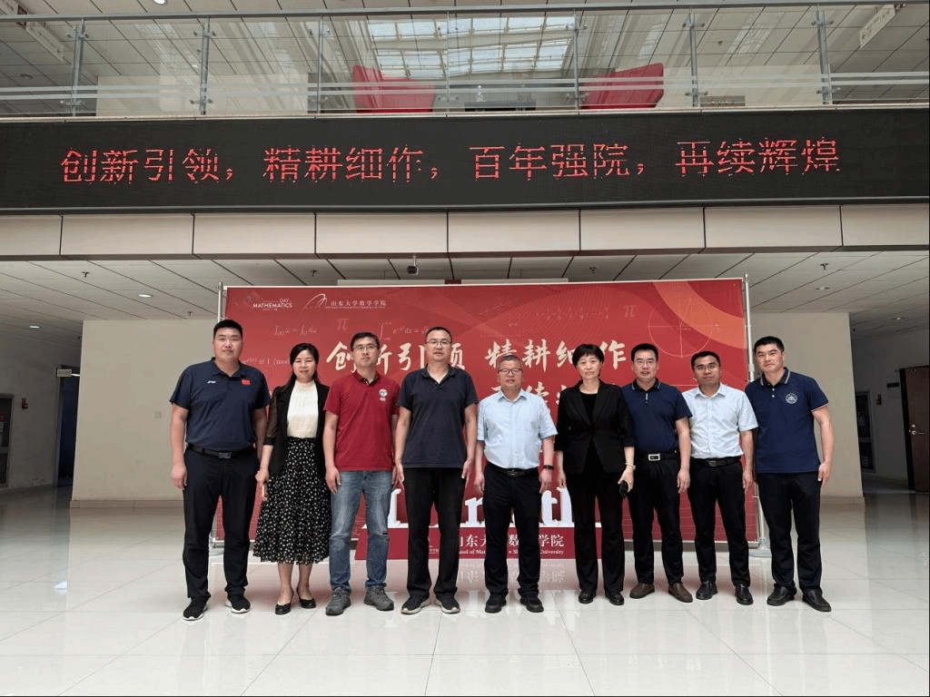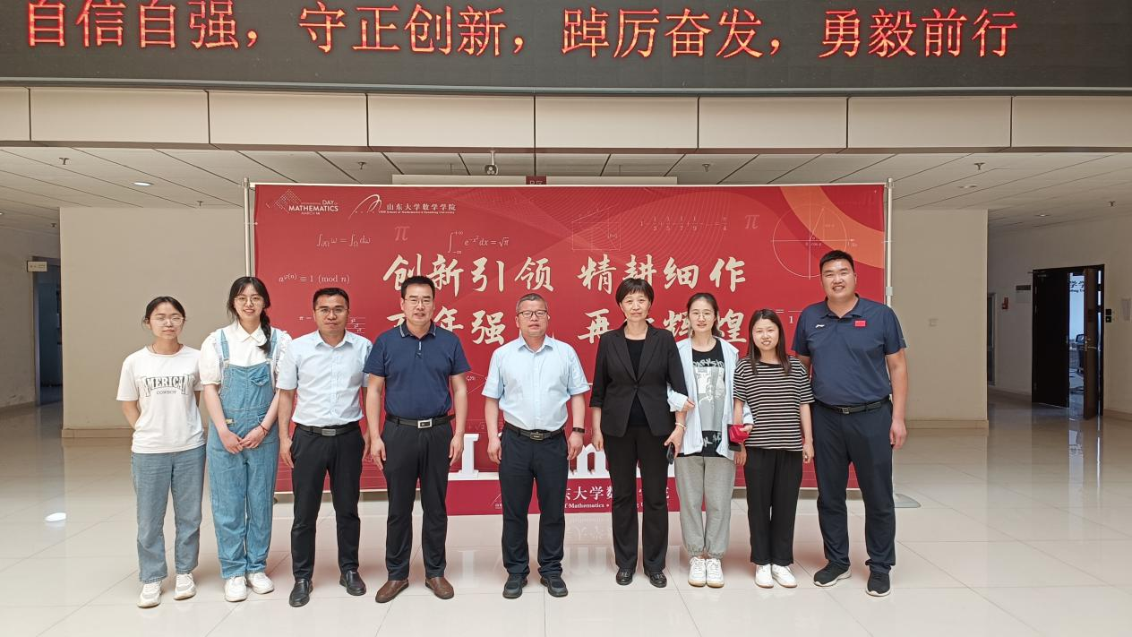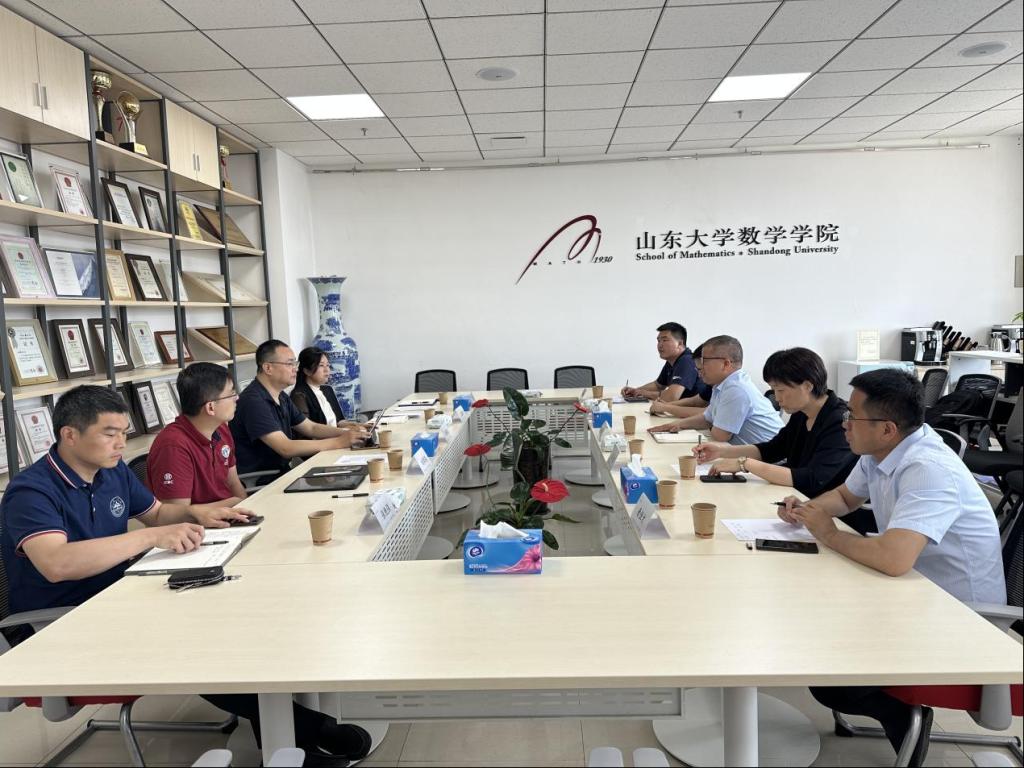 一行5人在院长韩小森带领下赴山东大学数学学院调研交流。山东大学数学学院常务副院长胡锡俊,副院长刘丙强,党委副书记王苗雨、张艳强,人事秘书姜杨等热情接待了调研组并进行座谈交流。