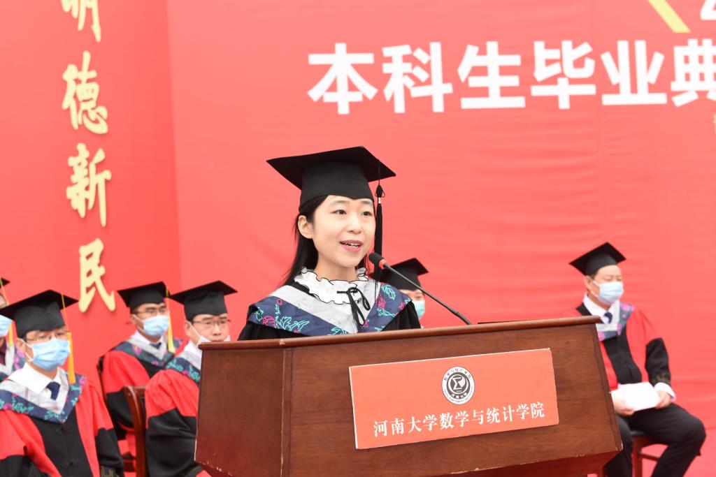 追忆青葱岁月,数院毕业生泪眼婆娑,饱含对母校的眷恋与不舍。数学与应用数学专业2016级明德计划实验班学生解雯佳代表毕业生发言,深情感谢母校和老师们的悉心培养。她说:“学院的一草一木、一砖一瓦都见证着我们的茁壮成长,承载着我们的美好回忆。毕业后,大家一定要牢记校训“明德新民,止于至善”,弘扬百折不挠、自强不息的河大精神,培养与时俱进的创新思维,勇于担当社会责任,积极投身祖国建设。”一言一语饱含深情,一字一句铿锵有力,表达了数院学子爱国报国、爱校荣校的深沉情怀。
