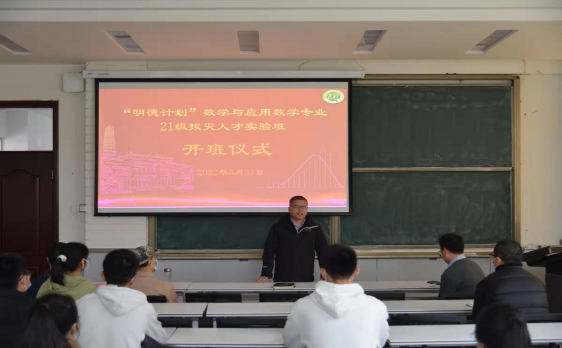 3月31日下午,“明德计划”数学与应用数学专业21级拔尖人才实验班开班仪式在学院一楼报告厅举行,学院院长韩小森,党委副书记赵红磊,副院长解俊山、唐恒才,实验班全体导师以及21级实验班的25位同学参加了开班仪式。仪式由解俊山主持。