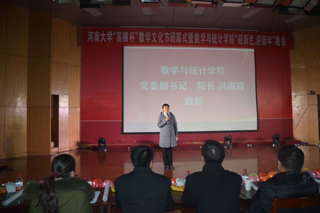 冯淑霞致辞,她肯定了2019年学院学生工作取得的成绩,同时表达了对师生在新一年中的期待与祝福。希冀老师们坚守教学科研一线,站稳三尺讲台、追求科学精神,做好新时代的“筑梦人”;同学们能够继往开来,秉承数学人的特质和精神,专注专业学习,同时努力提高自身综合素质,成为德智体美全面发展的社会栋梁之才。