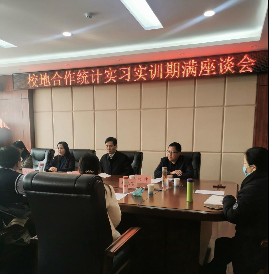副院长解俊山、统计系主任郑晨和应用统计专业硕士部分学业导师一行七人,赴开封市统计局参加校地合作统计实习实训期满交流座谈会。开封市统计局局长高本山、副局长杨文娣、办公室主任杨坤、人事科科长文静,以及完成专业实习任务的部分研究生参加了座谈会。