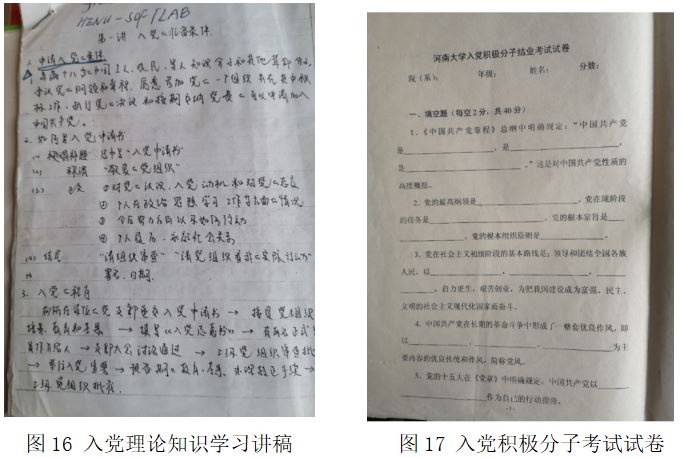 我作为入党较早的学生党员,第一批介绍入党的发展对象是2000级的学兄和学姐。在此过程中,我发现入党积极分子对党的基本知识掌握不够牢固,于是在2002年暑假,我手写了一份理论知识讲义,从当年9月份开始,给2001级入党积极分子进行讲解,效果较好,以后又连续进行了几个学期。