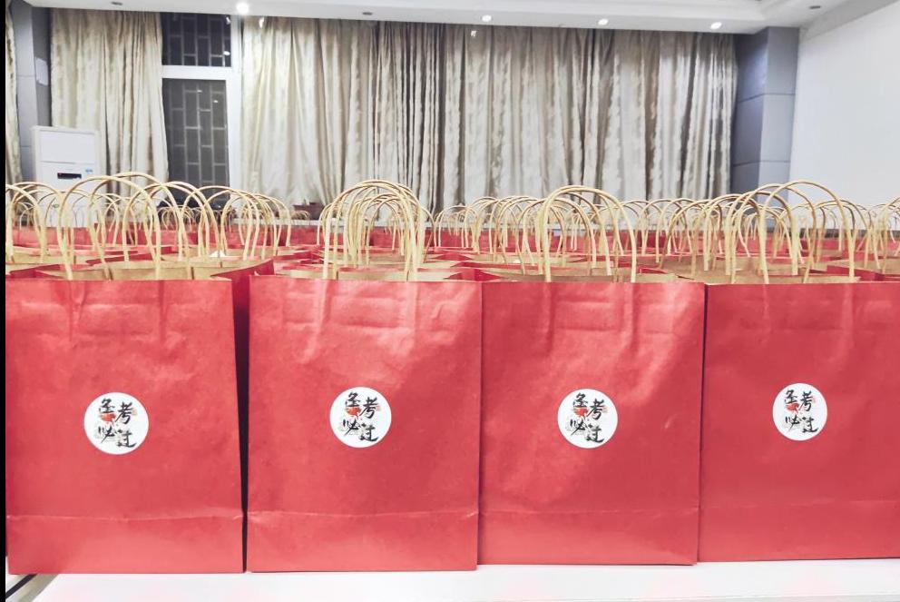 会议最后,学院领导为学生代表送上了“逢考必过”考研加油包,一份份精美礼盒寓意着前程似锦,一个个橙子寓意着心想事“橙”,一张张手写卡片表达着衷心的祝福,一个个口罩表达着深深的关切,每一份礼包都饱含着学院对考研学子的祝愿与期盼。