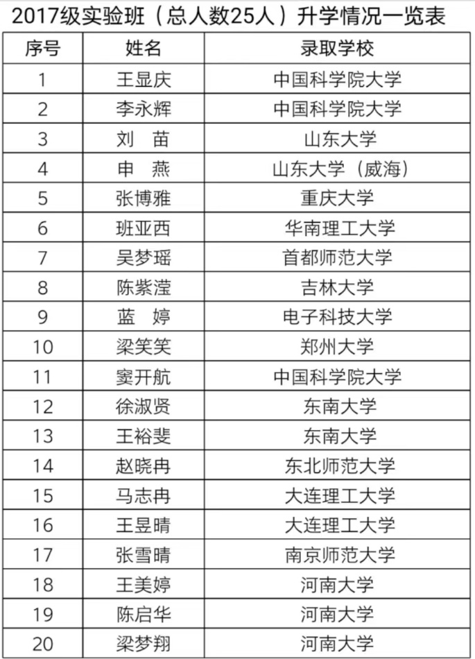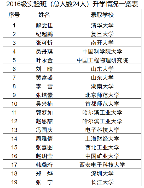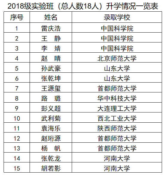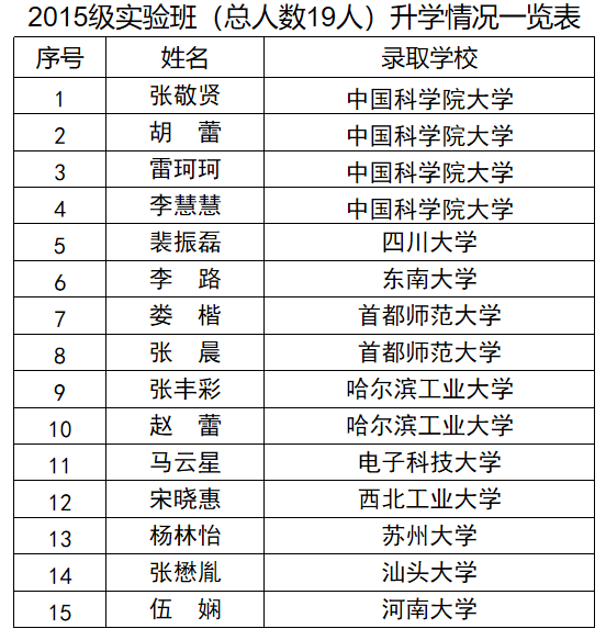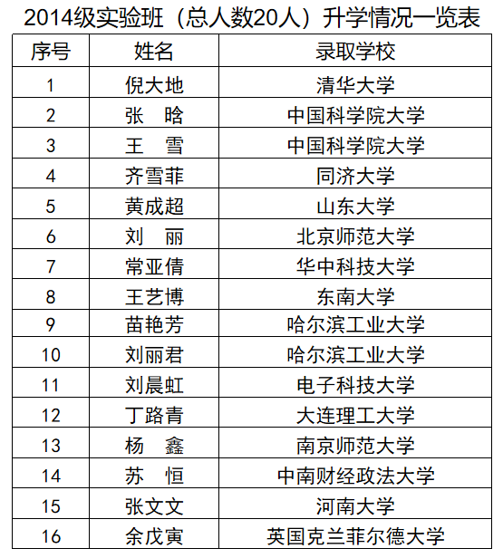 近五年实验班学生平均考研录取率达到80%,大部分学生保送或者考取中国科学院、清华大学、复旦大学和南开大学等全国著名高校和科研机构攻读硕士学位或者硕博连读。
