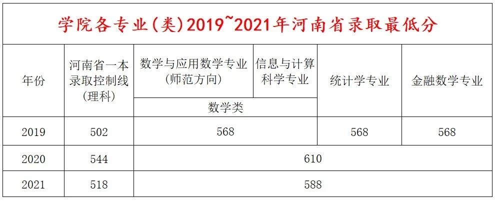 学院开设有数学与应用数学(师范方向)、数学与应用数学(明德计划实验班)、信息与计算科学、统计学、金融数学四个本科专业。其中,数学与应用数学专业为国家级一流本科专业建设点、河南省专业综合改革试点专业,统计学、金融数学专业为国家级一流本科专业建设点,信息与计算科学专业为河南省一流本科专业建设点、河南省特色专业。