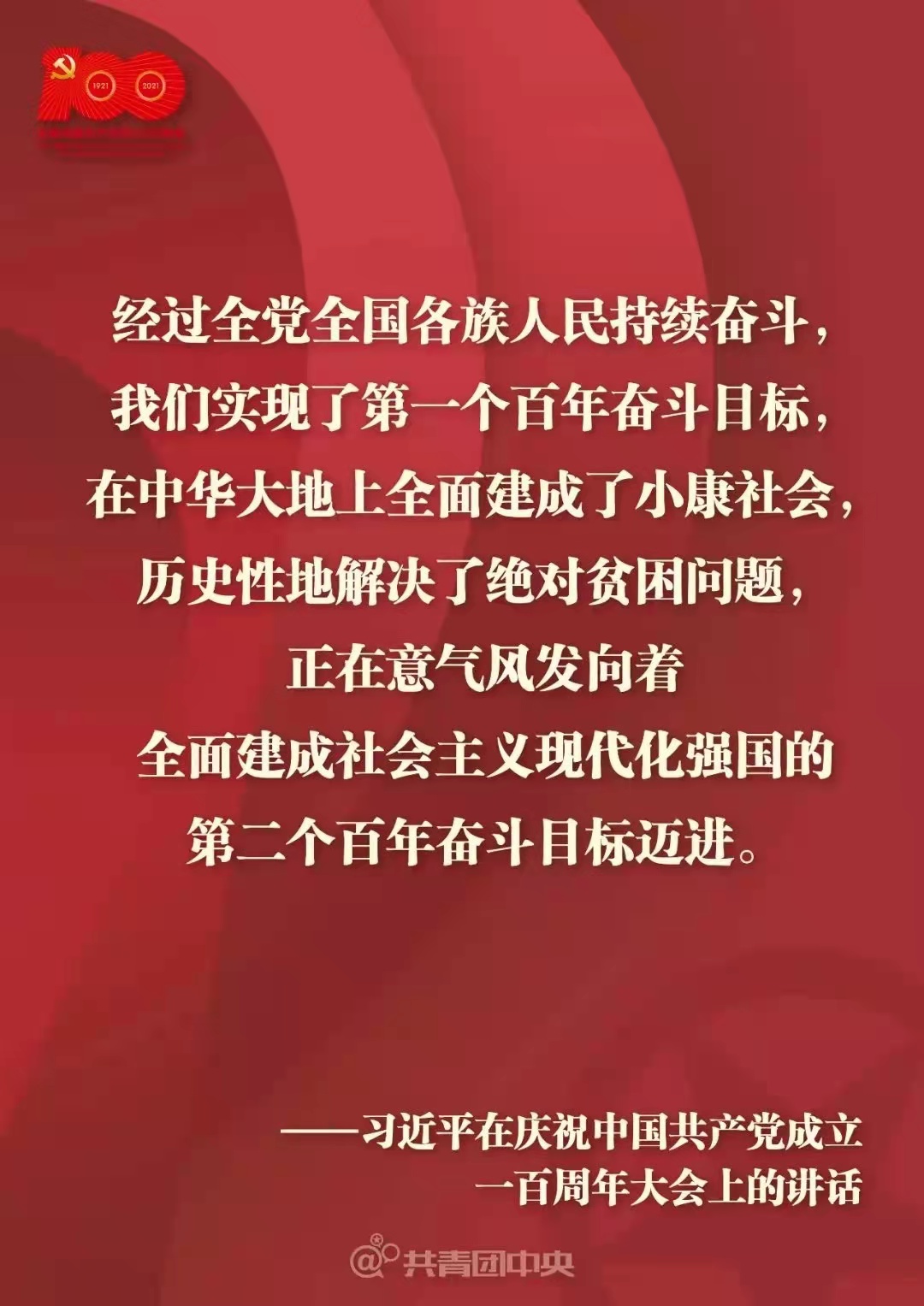 在这里,我代表党和人民庄严宣告,经过全党全国各族人民持续奋斗,我们实现了第一个百年奋斗目标,在中华大地上全面建成了小康社会,历史性地解决了绝对贫困问题,正在意气风发向着全面建成社会主义现代化强国的第二个百年奋斗目标迈进。这是中华民族的伟大光荣!这是中国人民的伟大光荣!这是中国共产党的伟大光荣!