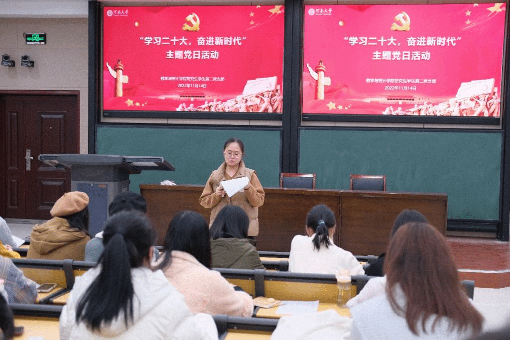 11月14日晚7:30,研究生第二学生党支部在南阶教室召开了“学习二十大,奋进新时代”主题党日活动,全体党员同志和入党积极分子参加会议。首先,支部书记刘霞宇同志领学了《习近平总书记在中国共产党第二十次全国代表大会上的报告》,接着与会同志共同观看了习近平总书记考察陕西延安和河南安阳新闻视频资料,并观看了纪录片《根脉》——红旗渠精神。